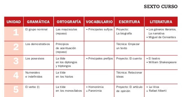 Según el curso y la editorial escogida, el libro estaba dividido en distintas secciones. En el ejemplo a continuación está mi libro de sexto curso de lengua castellana, y podéis observar como las secciones mencionadas, en este caso, son la gramática, ortografía, vocabulario, escritura y literatura. Además, aunque no quede explícito en el índice, recuerdo que cada unidad tenía una lectura al inicio con preguntas de comprensión lectora y ejercicios que nos ponían en contexto con lo que íbamos a trabajar específicamente en esa unidad.